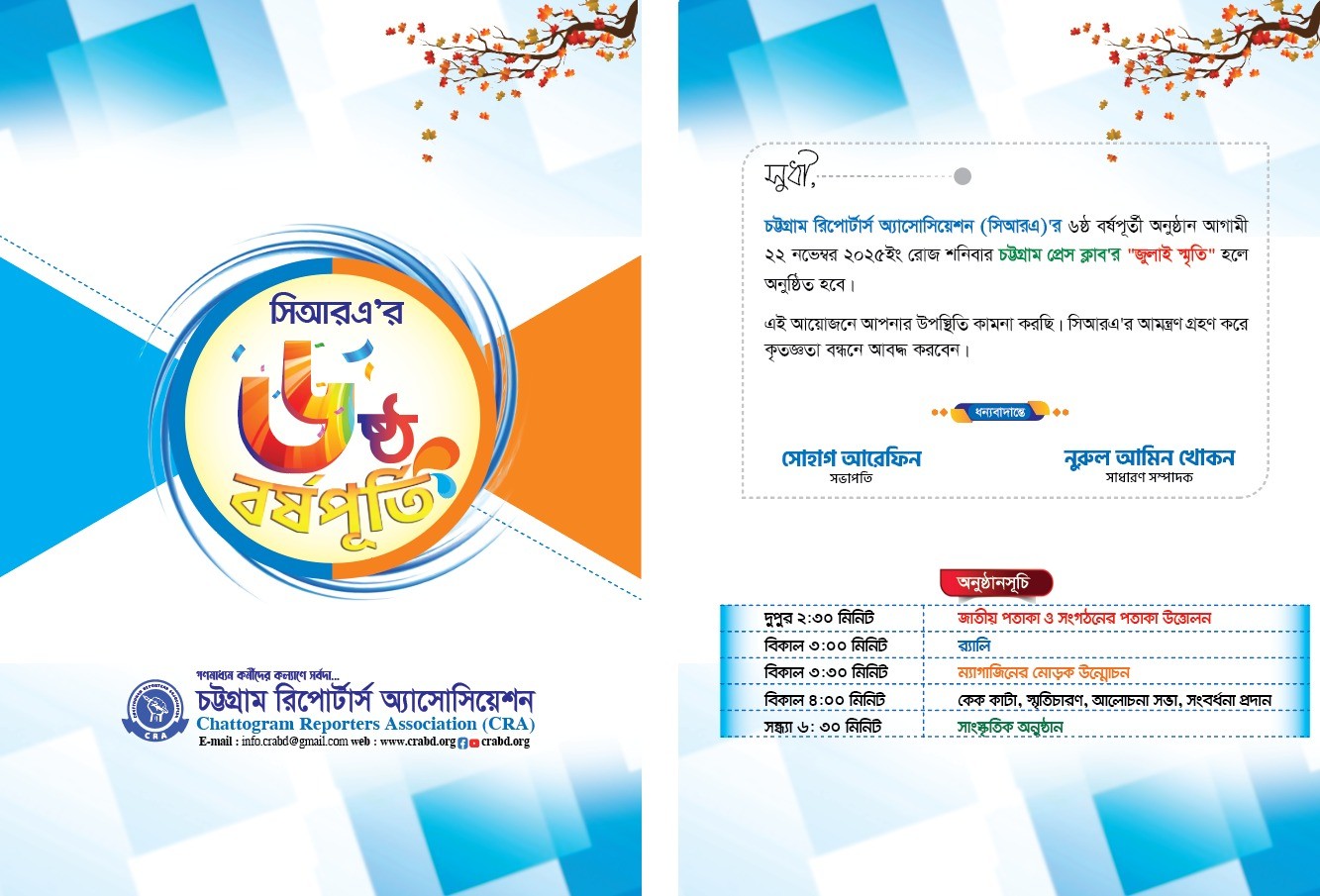 Chattogram Reporters Association (CRA) founded in 2023, is the only professional body of all working reporters based in Port City Chattogram, representing all newspaper, electronic media and news organizations.