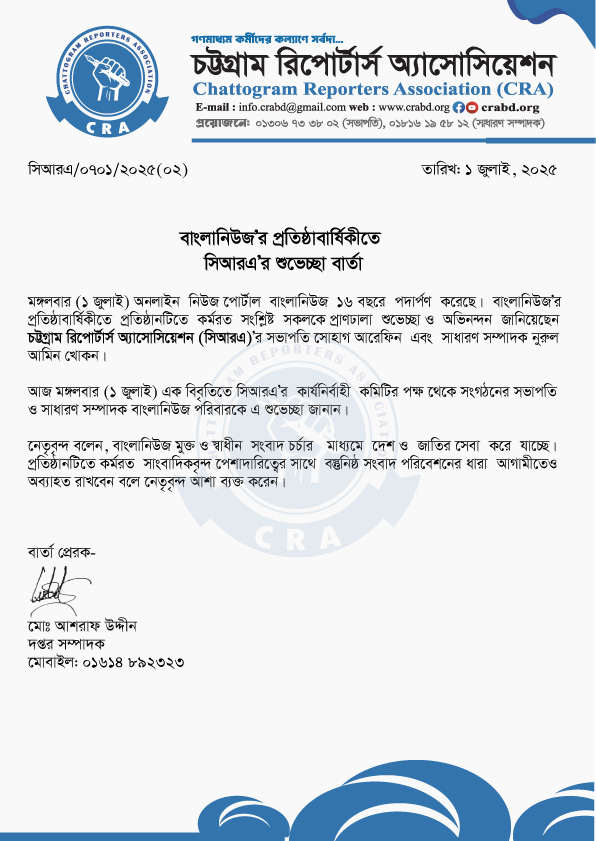 আজ মঙ্গলবার (১ জুলাই) এক বিবৃতিতে সিআরএ’র কার্যনির্বাহী কমিটির পক্ষ থেকে সংগঠনের সভাপতি
